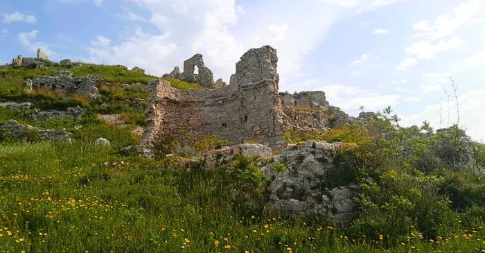 Sono costruzioni abitative, mentre a una trentina di metri circa, ecco una struttura particolare: un edificio religioso (?). Coperti da una rigogliosa vegetazione, gli aspetti planimetrici portano dritti a una considerazione: il paese era costruito su un piano scosceso. Balzano agli occhi alcune strutture di ampie dimensioni (abitazioni nobiliari?). La curiosità ruota attorno alla perfezione delle forme, ai lineamenti e angolature che delineano segmenti e tracciano architetture dal gusto retrò. E poi, l’innata capacità di realizzare - con apparente facilità - in posizione strategica. Perché mai? Una difesa rude e aggressiva contro le incursioni dei pirati (il Mar Mediterraneo dista a soli sette km).
